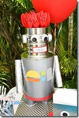 For treats? I’d make some bright blue punch to drink and wrap some candy bars like little mini iPods, using Hershey kisses for the earbuds. To up the technology factor? A homemade robot/utensil holder.