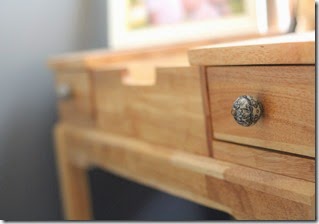 In other news, I finally finished up my vanity! I really really love it. I think the decision to put fabric inside of it was one of the best I’ve made. Other changes I made? New knobs, a hint of salmon pink inside of the drawers just because, a stylish carved wood addition to the mirror frame, and a fresh stain. I also had Josh cut the jewelry box to a smaller size so I could actually use the top area for my hair dryer and curling irons. What do you think?